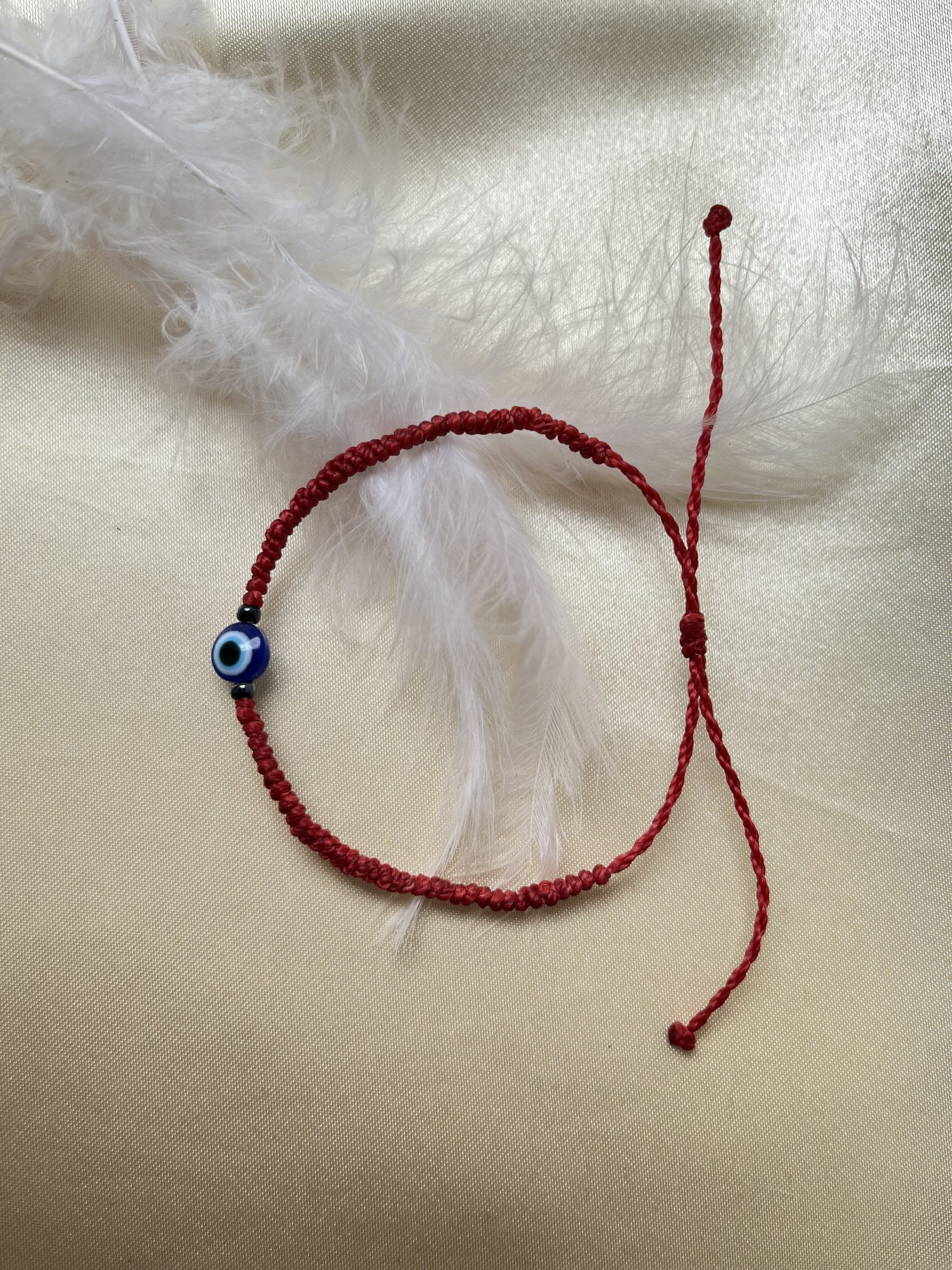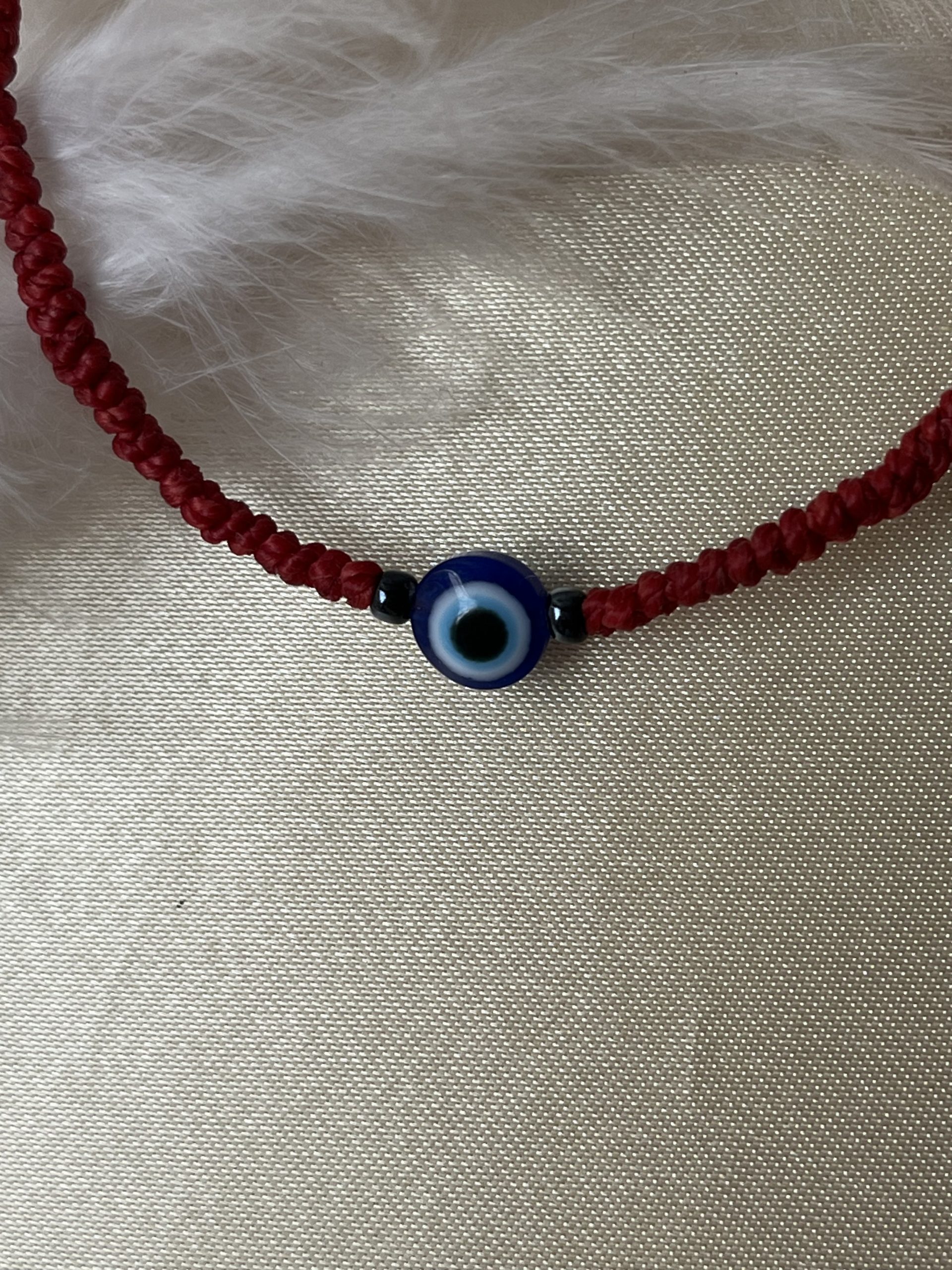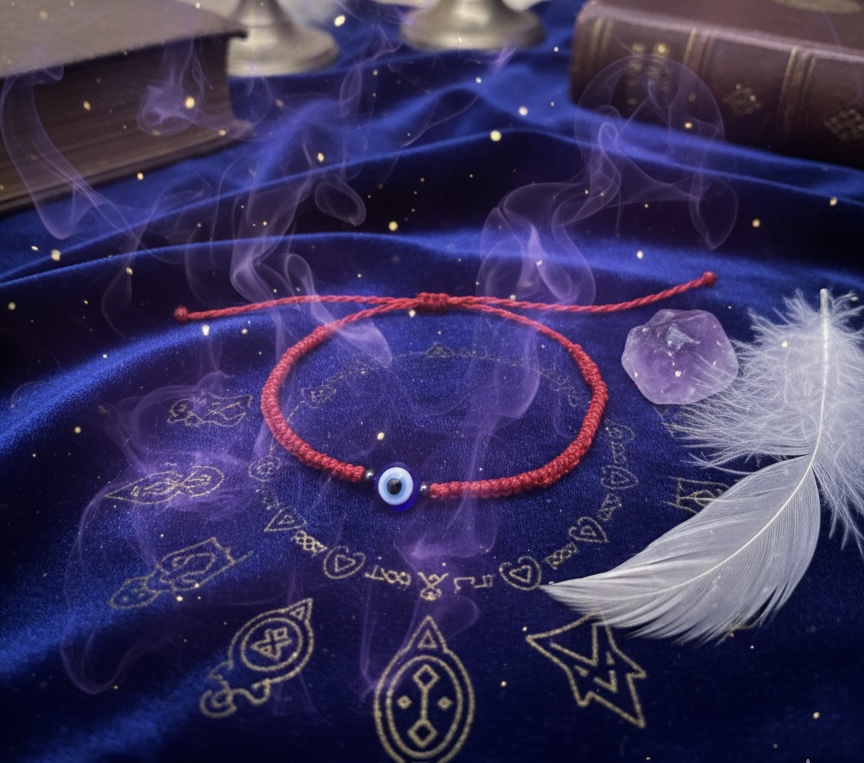 Il unit le fil rouge, symbole de destin et de chance, et l’œil bleu, bouclier contre les énergies négatives.